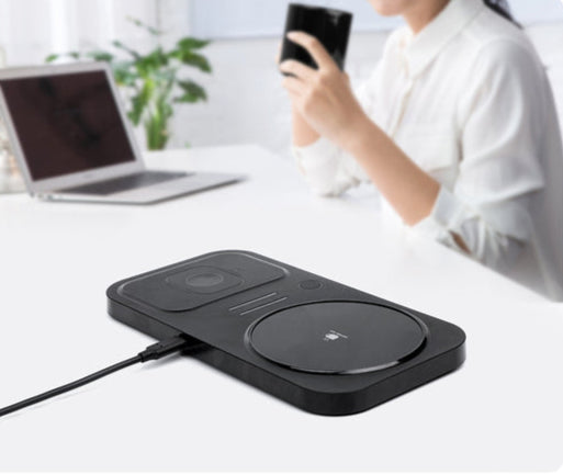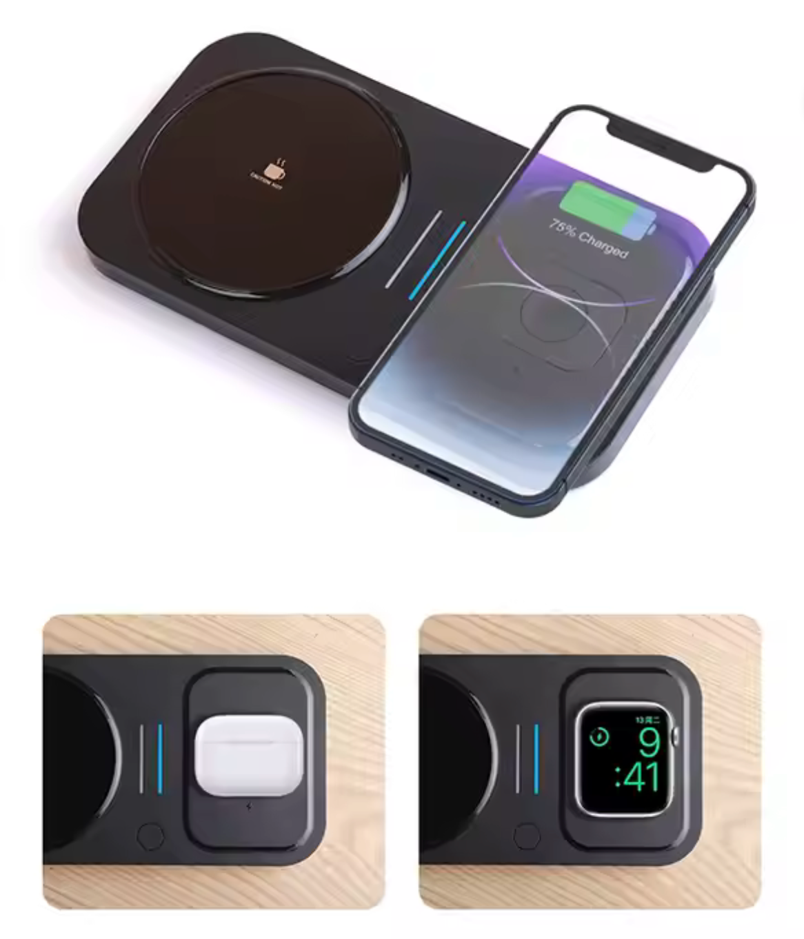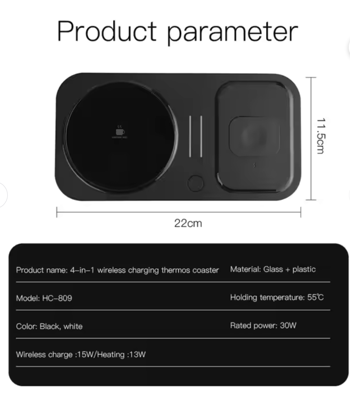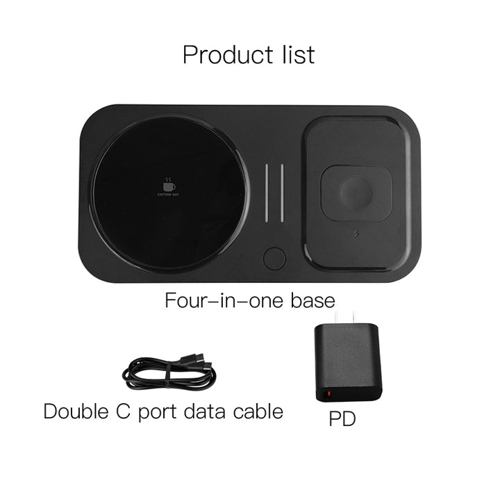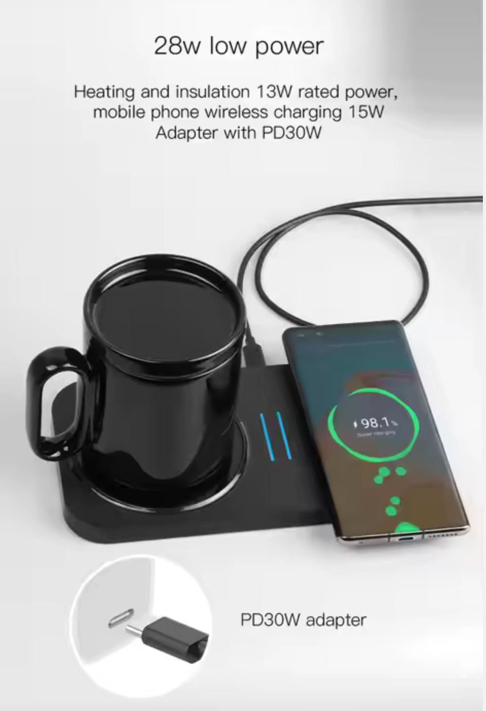 This versatile mug warmer is designed to accommodate any mug, maintaining an optimal temperature of 131 degrees. It also features wireless charging capabilities for your phone, Apple Watch, and AirPods. Included are a USB-C cable and charger for seamless connectivity.