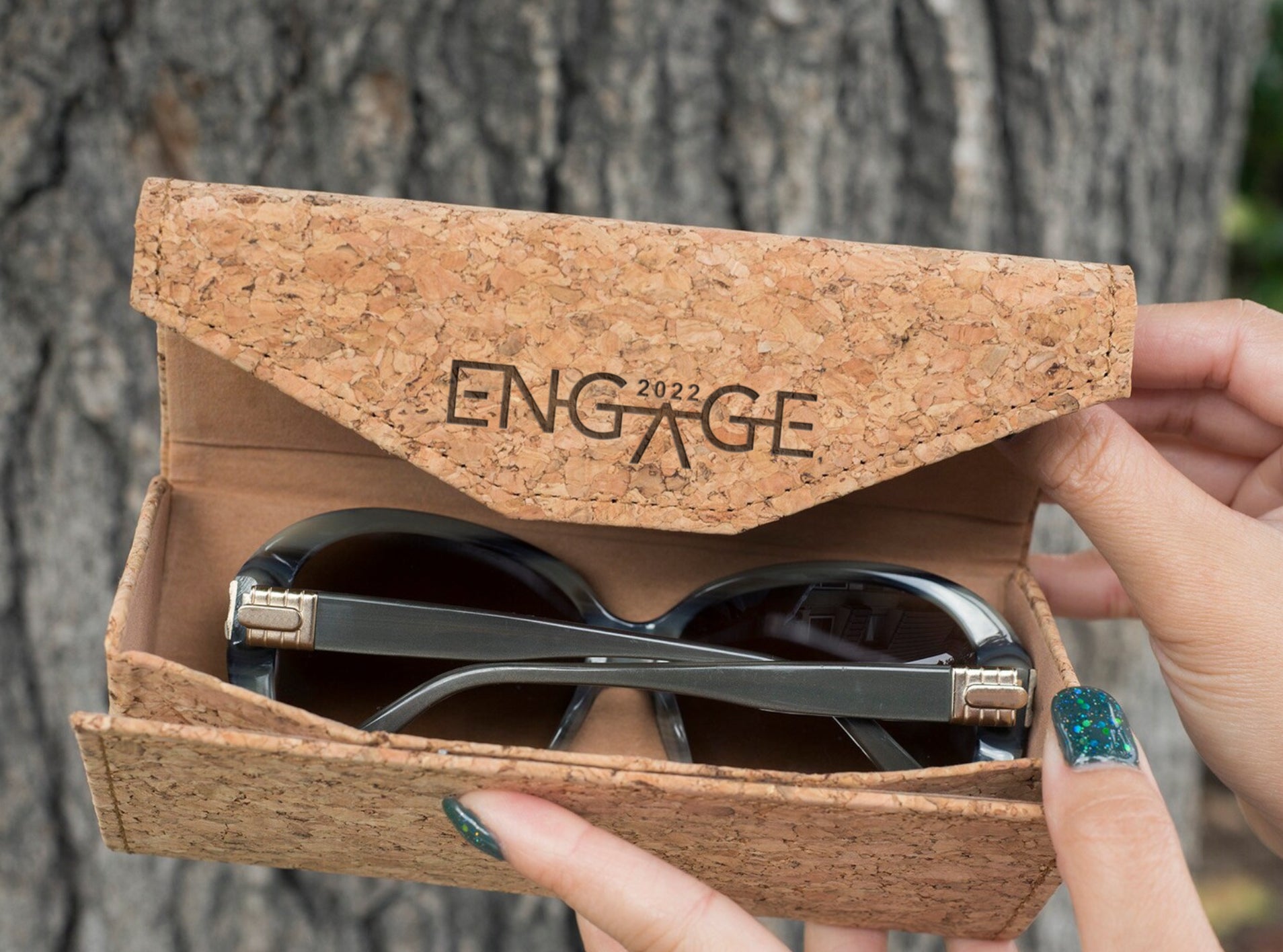 This sunglass case is foldable and made of cork, the kind that comes from trees, not the kind that you put in bottles.