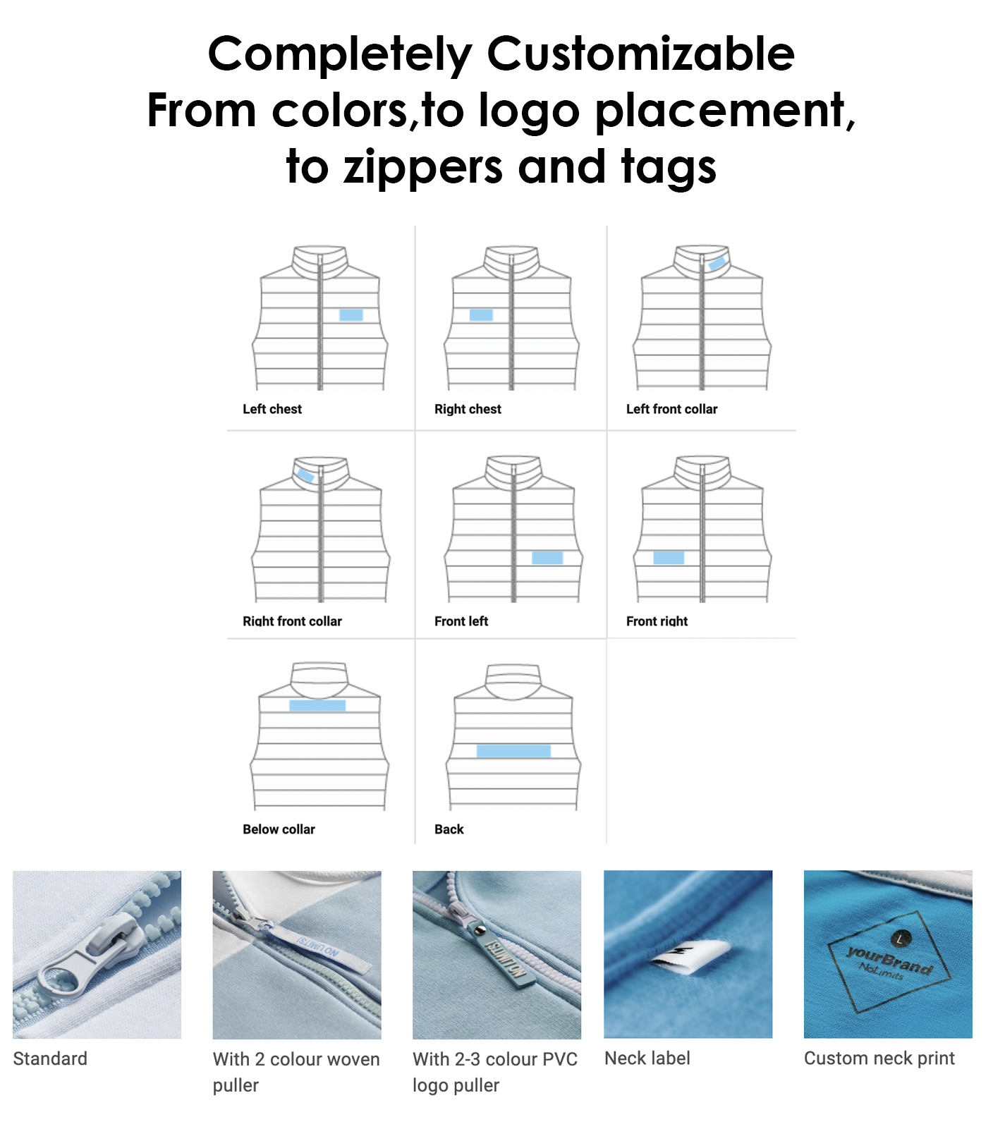 - Zipper puller style: Standard, woven fabric, or PVC logo puller