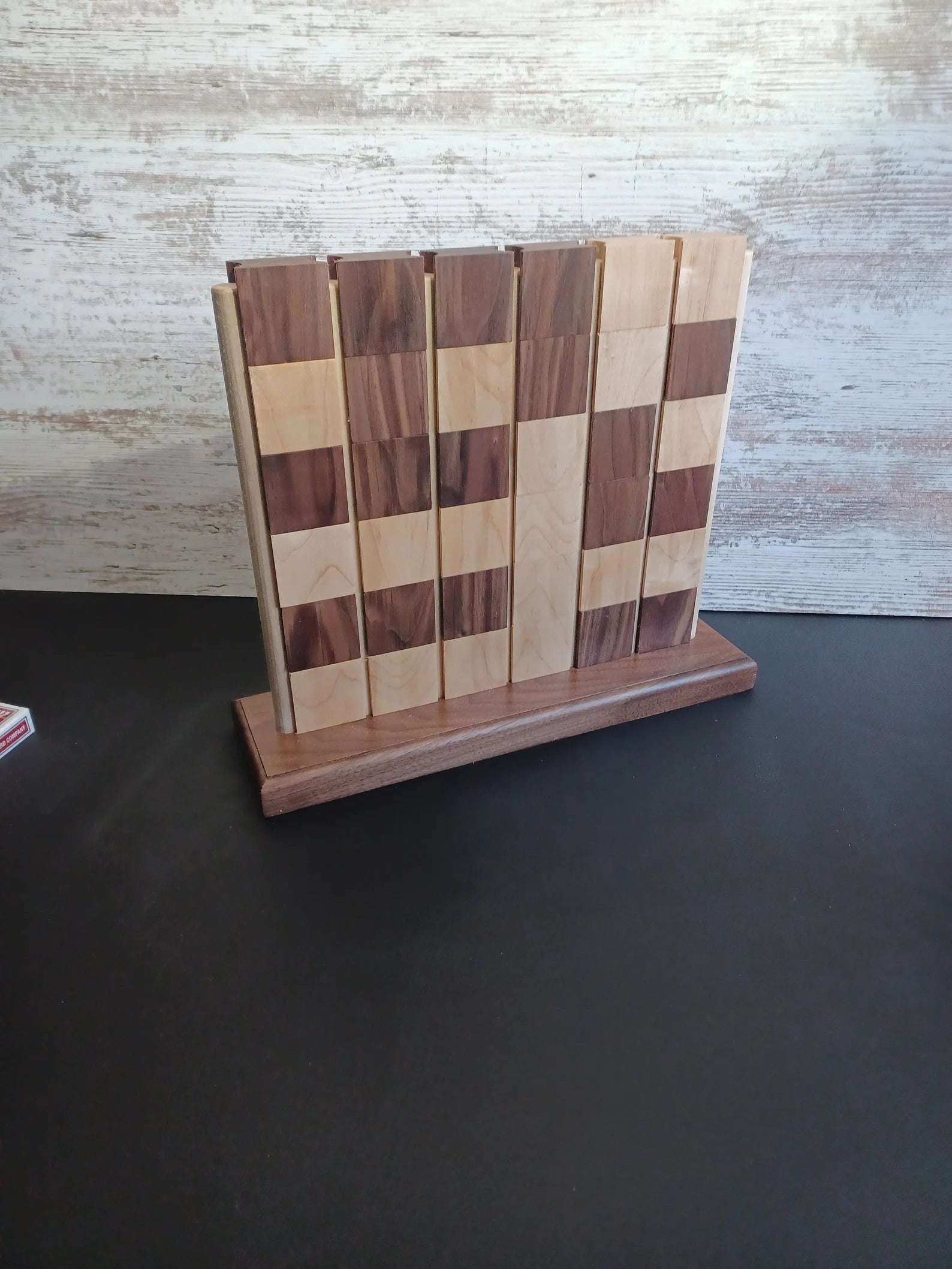 This Handcrafted Hardwood Connect Four game is constructed with precision using walnut and maple wood. It serves as a sophisticated and elegant addition to your selection of traditional two-player games with its sleek design and smooth sliding game pieces.