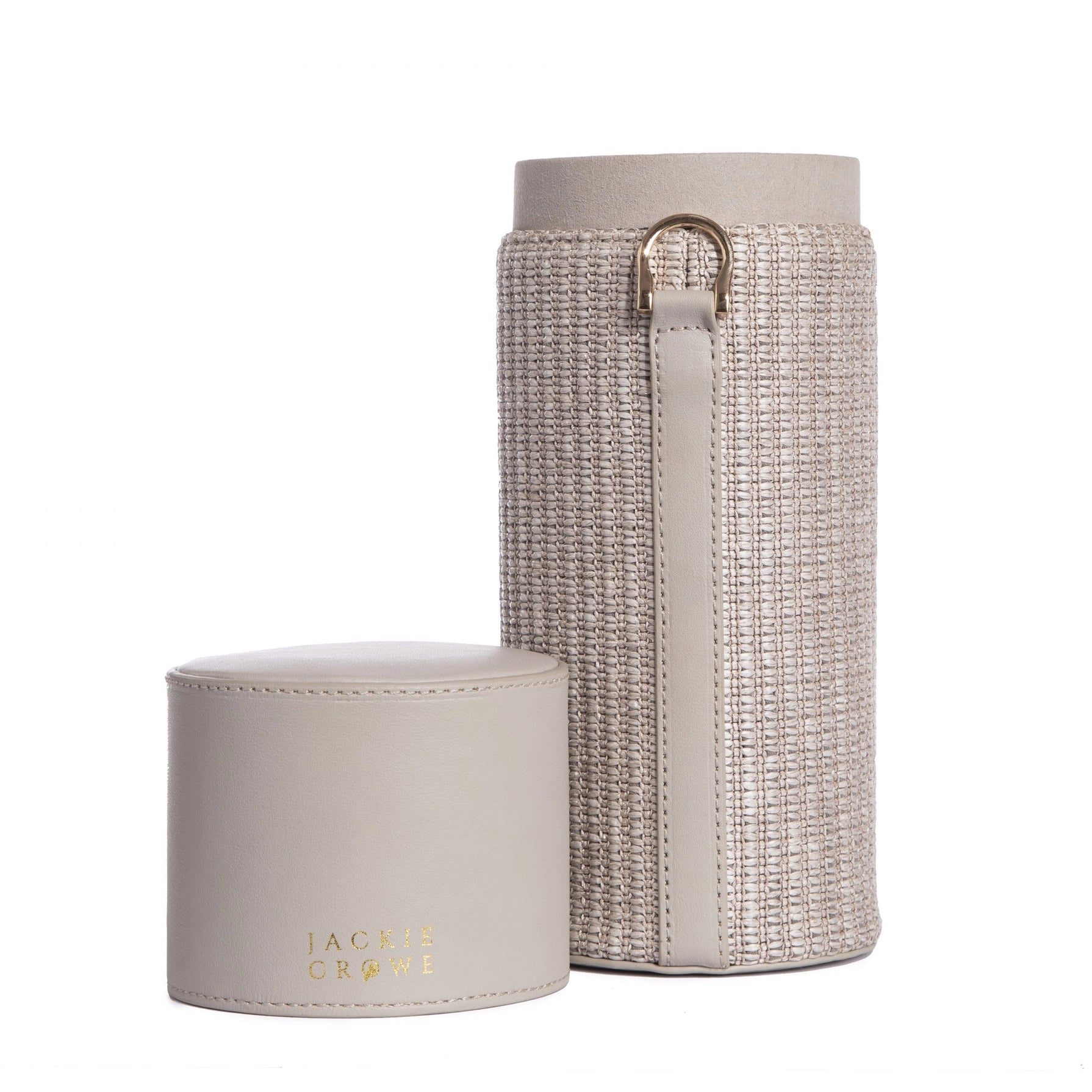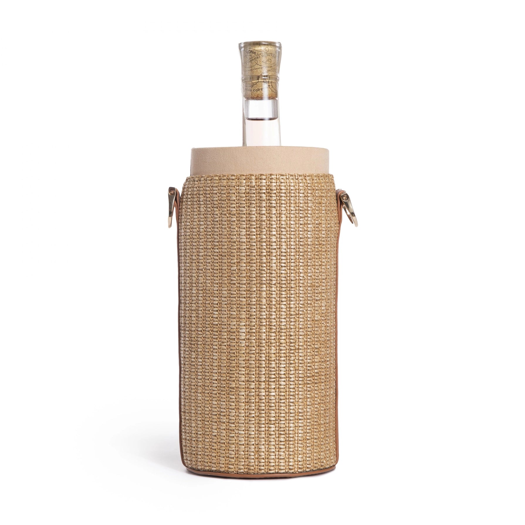 Carry your favorite wine, with style and class. Made from vegan leather and woven raffia fabric, this bag features a gold-finish and removable crossbody strap with adjustable needle buckle. The interior is lined with faux suede. The bag also features a main compartment to easily carry wine or water.