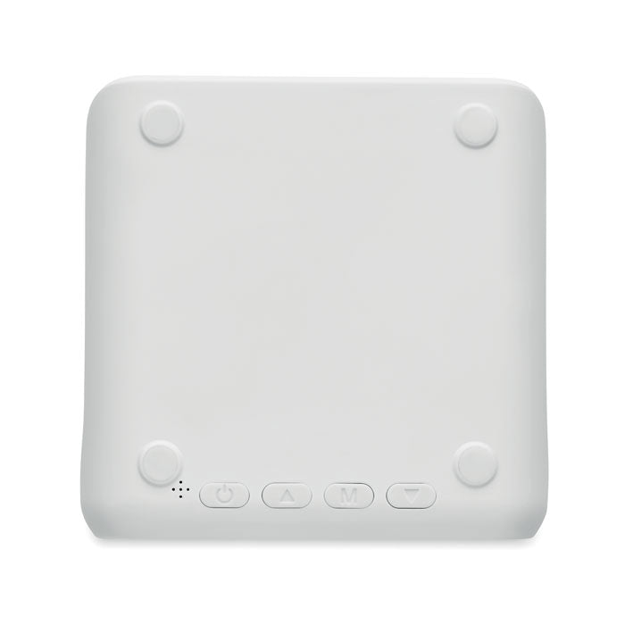 10W wireless charger device including white LED time display alarm clock in ABS casing. Contains USB charging cable with type C. Output: DC 9V/1.10A (10W) for quick charging. Compatible with latest Androids, iPhone® 8, X and newer.