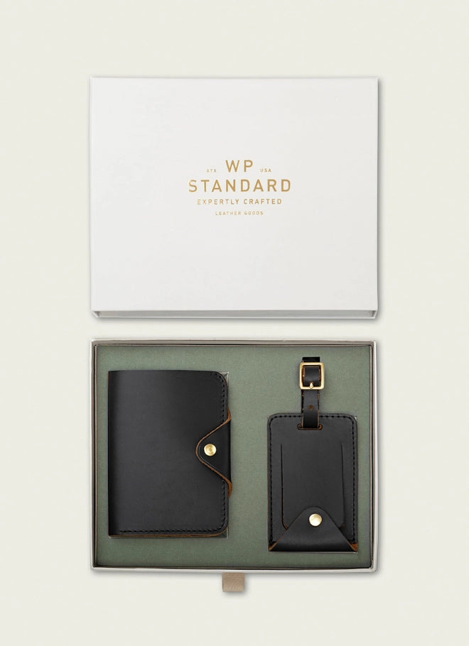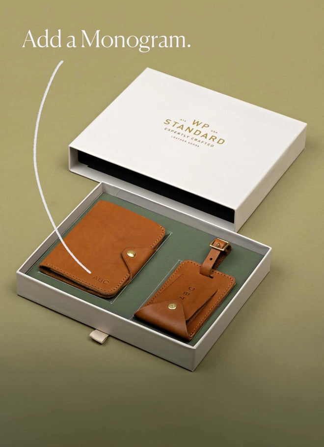 A refined addition to your travel gear - a full-grain leather passport wallet and luggage tag, elegantly packaged in a gift box.
